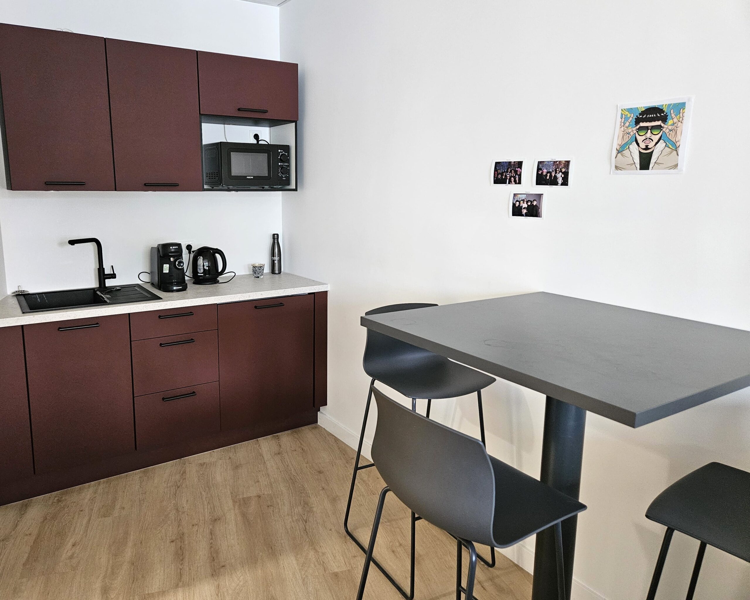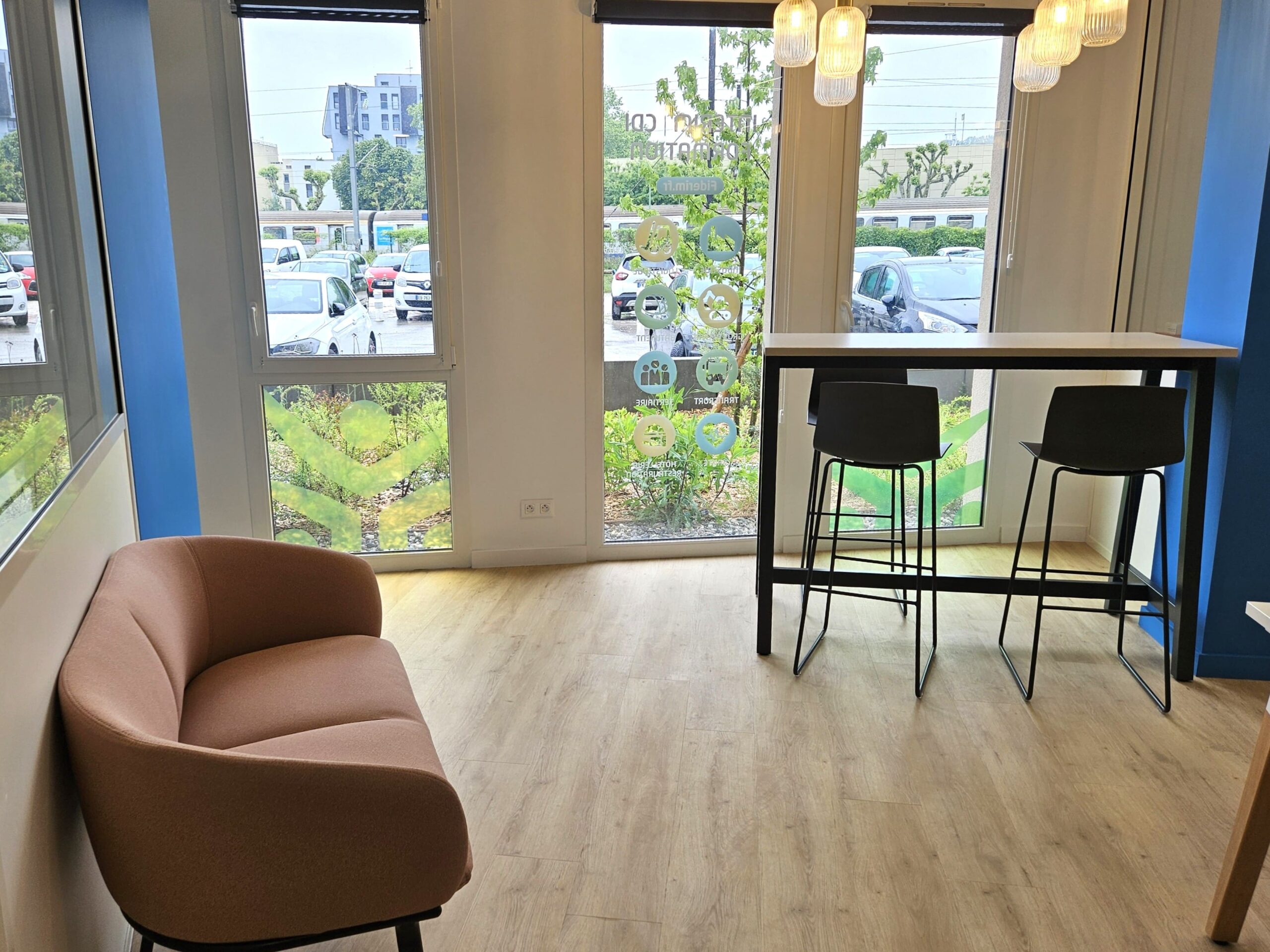 Un lieu dynamique, avec une table haute OGI et 4 tabourets Kabi.